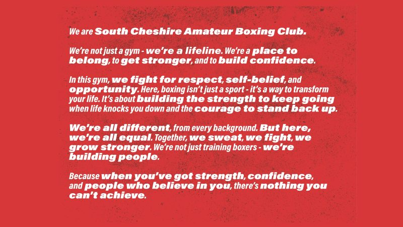 South Cheshire Amateur Boxing Club (SCABC), a registered charity, secured over £1 million in funding to develop a brand-new, purpose-built boxing club in the heart of Crewe. With this transformational opportunity, they needed a brand and digital presence that truly reflected their mission: to inspire, empower and unite people of all ages and backgrounds through boxing.